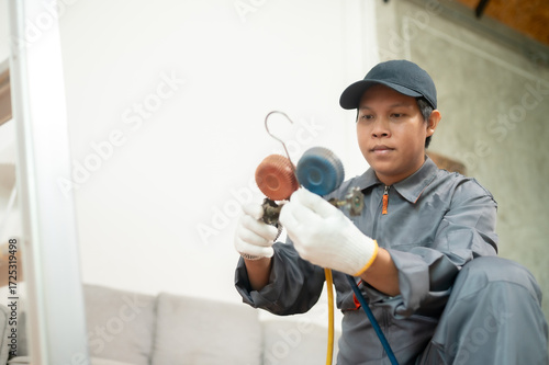 Air Conditioning Technician at Work: Focused air conditioning technician expertly using tools, exemplifying the importance of skilled trades in modern home maintenance and service.