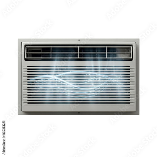 Air conditioning unit with a sleek design, featuring a front grille and vents. Isolated on a transparent background, ideal for commercial use.