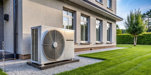 Air heat pump unit installed next to a residential house,
