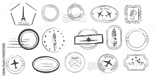 Air mail stamp retro vintage postage sign. Post stamp with plane icon, border template, rubber wavy frame for envelope. Postmark seal design element.