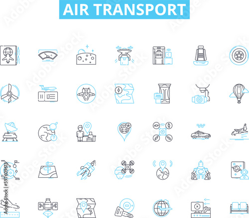 Air transport linear icons set. Flight, Plane, Jet, Helicopter, Airport, Runway, Takeoff line vector and concept signs. Landing,Altitude,Cabin outline illustrations