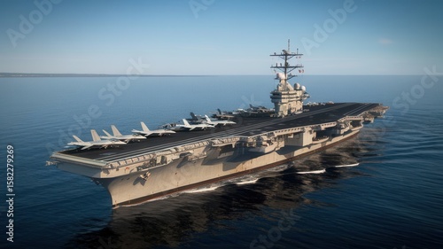 Aircraft carrier sailing through ocean waters showcasing military readiness