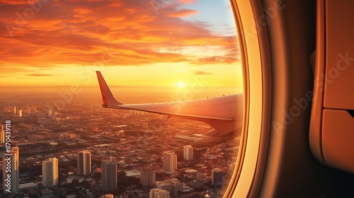 Aircraft taking off viewed through airport terminal window, aviation departure scene