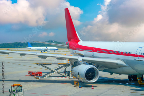 Aircraft undergoing pre-flight maintenance, refueling and on-board catering for a passenger against the backdrop of the airfield and runway