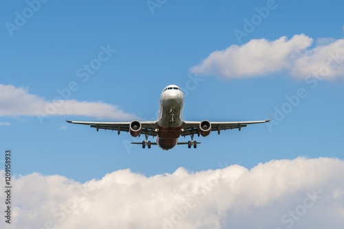 Airplane approaches landing surrounded by fluffy clouds in clear blue sky during bright daylight hours