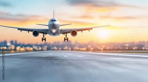 Airplane Approaching Landing Over Runway at Sunset with City Skyline
