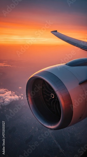 Airplane engine and wing in a stunning sunset sky over the clouds