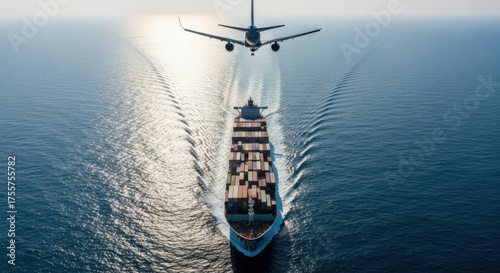 Airplane flies over cargo ship at sea