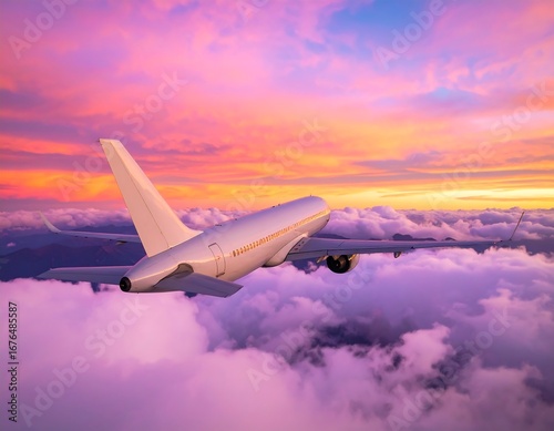 Airplane flying above clouds at sunset