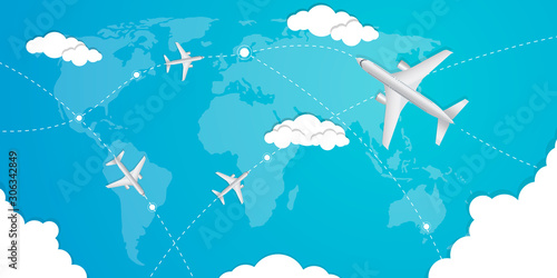 Airplane flying and trace a blue dashed trace line on a world map. Travel concept illustration in vector. Flat design.