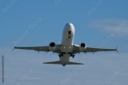 Airplane in the cloudy sky. The plane gaining altitude after takeoff from the airport.