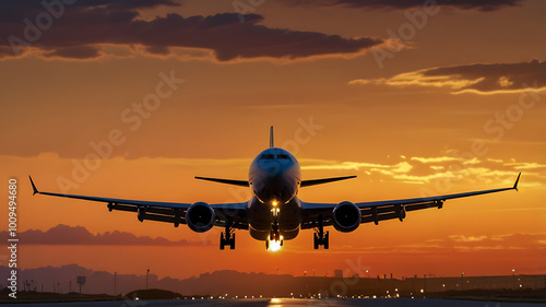 airplane landing at sunset