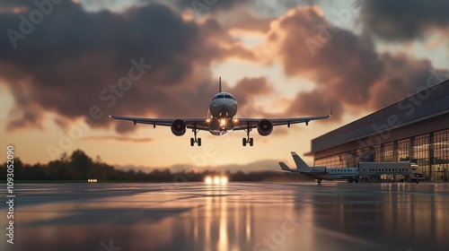 Airplane landing at sunset, reflecting on wet runway near hangar.