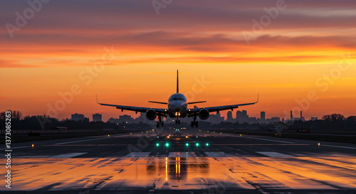 Airplane landing on a runway at sunset with a city skyline in the background.