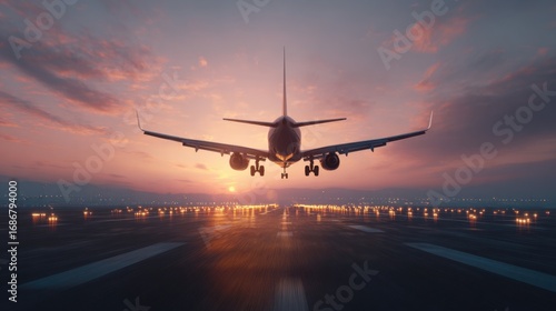 airplane landing sunset cityscape