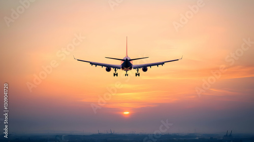 Airplane Silhouette Landing Against Brilliant Orange Sunset Sky