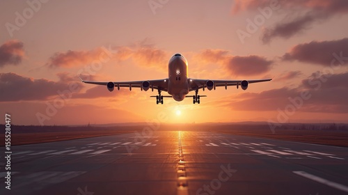 Airplane Silhouetted Against Sunset While Approaching Runway
