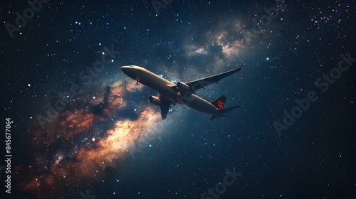 Airplane Soaring Through Starry Night Sky Amid Milky Way Galaxy
