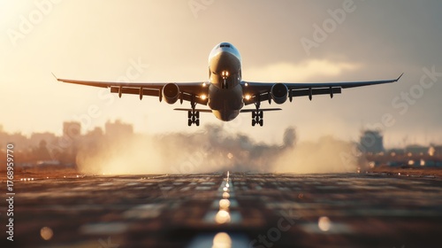 Airplane takes off at sunset, showcasing powerful ascent and dynamic motion, with stunning golden sky and urban skyline in the background for travel themes.