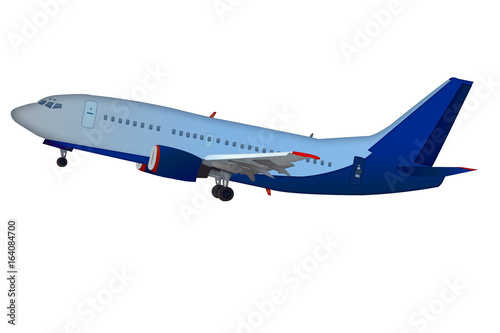 Airplane taking off isolated on blue sky. Realistic flying plane.