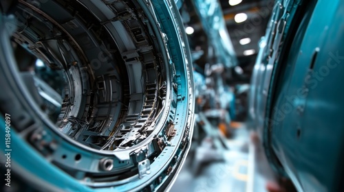 Airplane wheel compartment with mechanical components and hydraulic systems, essential for safe landing and takeoff. Precision engineering and aviation safety concepts.