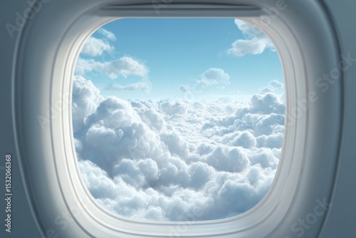 Airplane window view of puffy clouds