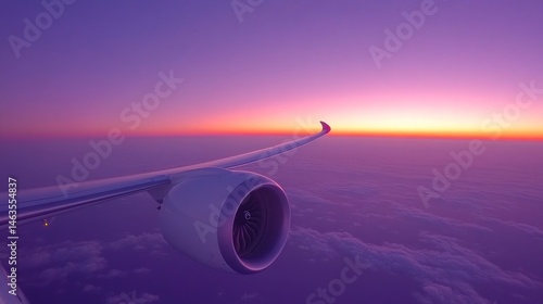 Airplane wing and engine at sunrise or sunset creating a travel destination