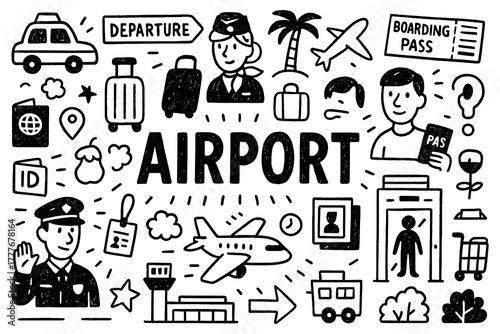 Airport doodle composition with airplanes, passengers, and security check icons, Transparent Background