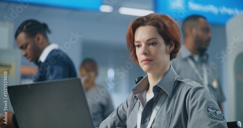 Airport Security Checkpoint: Close Up of Female TSA Officer Working on Laptop. Transportation Security Administration for Travel Safety. In Background, Airport Staff Conducting Screening Procedures.
