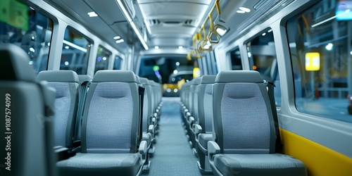 Airport shuttle service and travel concept. A modern, empty bus interior with sleek gray seats, illuminated by soft lighting, creating a calm and spacious ambiance.