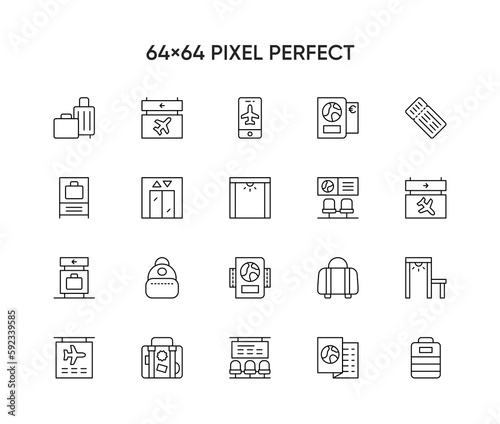 Airport terminal related vector line icons.