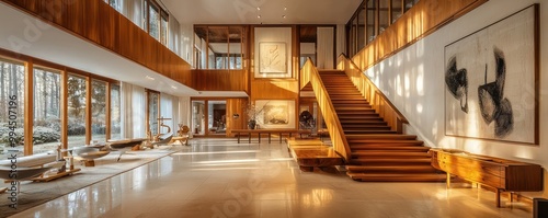 Airy Scandinavian foyer with high ceilings, a grand wooden staircase, and walls adorned with minimalist art