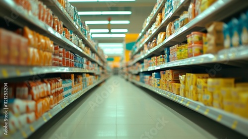 Aisle view in a grocery store showcasing colorful product packaging and shelves.
