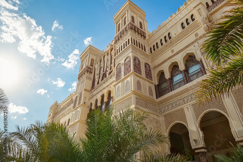 Al Qasr Hotel showcases stunning traditional Arabian architecture, surrounded by lush palm trees and bright blue sky. intricate details and grandeur evoke sense of luxury and cultural richness