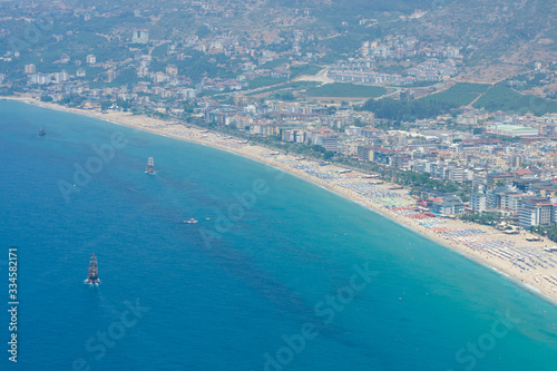 Alanya. Turkey. The city beach in Alanya. The coastline is receding into the distance. The view from the bird's eye view. Alanya - a popular holiday destination for European tourists.