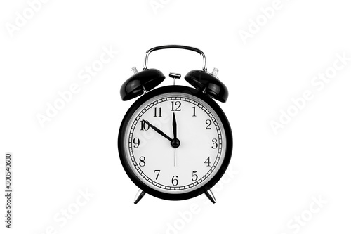 alarm clock black with a white dial on an isolated white background