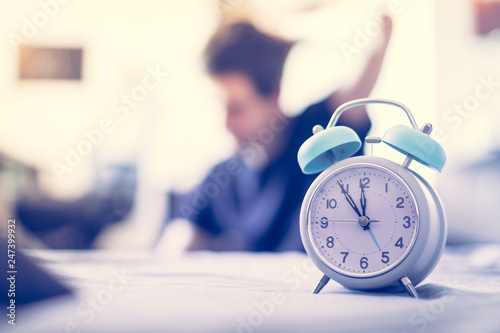 Alarm clock in the morning. Young wakes up and stretches in the blurry background.