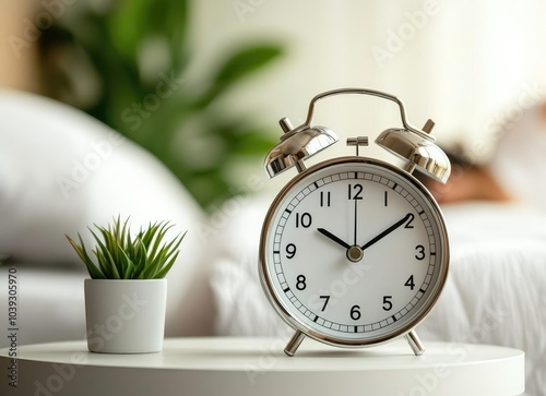 Alarm clock on a bedside table with a green plant, blurred person waking up in background.