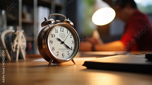 Alarm clock on table near business man working on laptop, meeting discussion people or team background, time management concept, focused on alarm clock