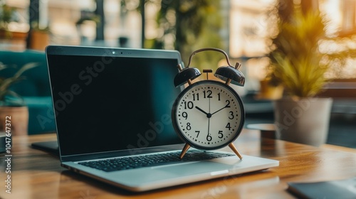 Alarm clock standing on laptop. Concept of work hours, deadline and limit screen time.