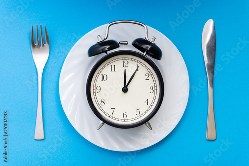 Alarm clock with fork and knife on the table. Time to eat, Breakfast, Lunch time and dinner concept.