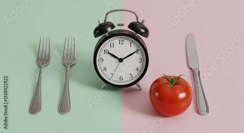 Alarm Clock with Tomato and Silver Cutlery on Split Green and Pink Background Time Concept