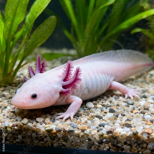 Albino axolotl resting on gravel substrate with green plants in the background in an aquarium tank