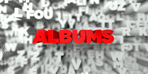 ALBUMS - Red text on typography background - 3D rendered royalty free stock image. This image can be used for an online website banner ad or a print postcard.