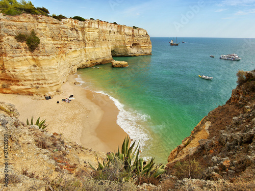 Algarve Portugal. Wild yellow rock cliffs and green-blue ocean