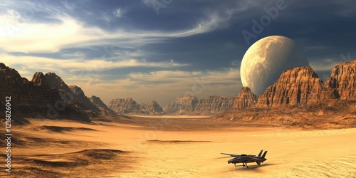 Alien desert landscape, spaceship landing, large moon. Sci-fi backdrop