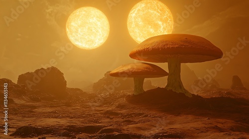 Alien Landscape Featuring Giant Mushrooms Under Twin Suns