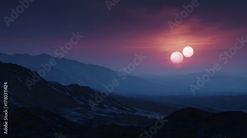Alien planet landscape at twilight with two suns setting over rugged mountains