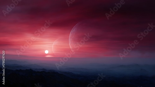 Alien planet landscape under a dramatic crimson sky with twin suns setting over misty mountains