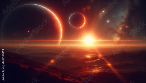 Alien Sunrise: Fiery Planets and Nebulous Sky